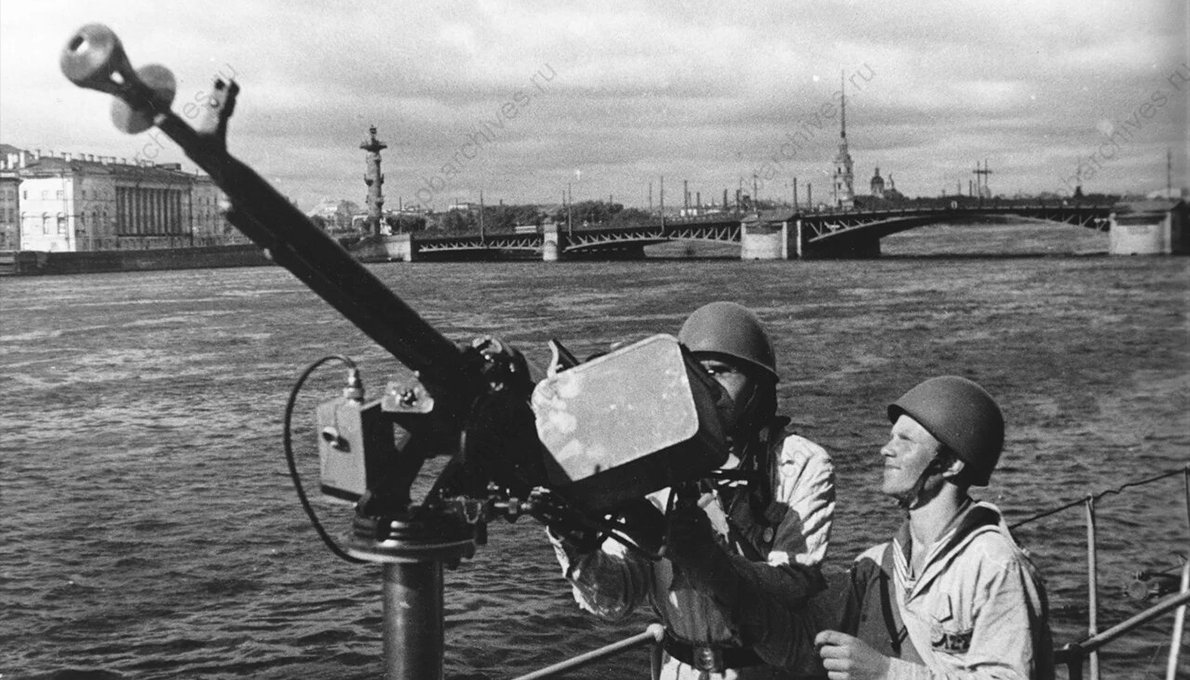 Балтийские моряки у зенитного орудия на палубе военного корабля у Республиканского (Дворцового) моста. Автор съемки: Трахтенберг Давид Михайлович, ЦГАКФФД СПб. Ар 110753