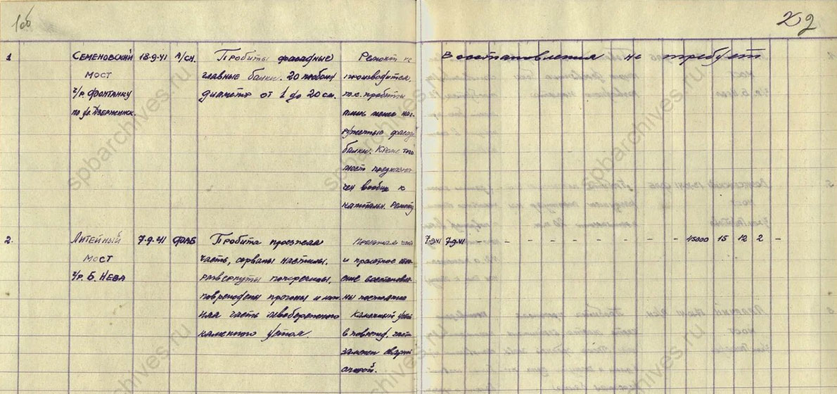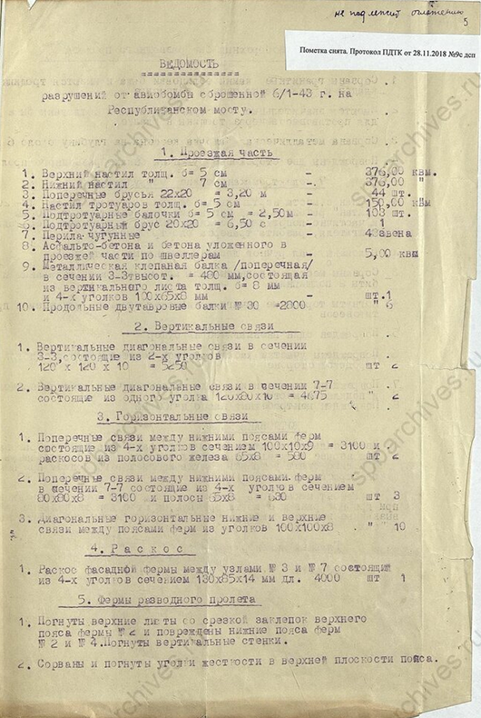 Ведомость разрушений от авиабомбы, сброшенной 06.01.1943 г. на Республиканском (Дворцовом) мосту. Подлинник. ЦГА СПб. Ф. 7384. Оп. 17. Д. 791. Л. 5