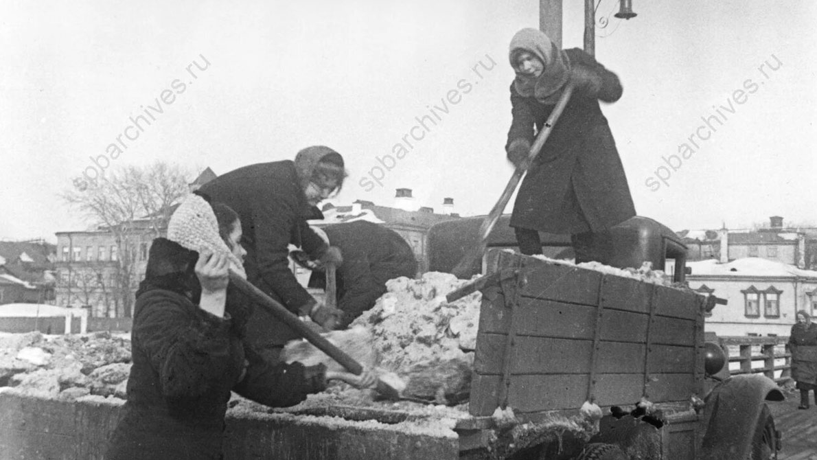 Разгрузка машины на Семеновском мосту во время воскресника по уборке снега и льда. Апрель 1942 г. Автор съемки: Капустин Владимир Илларионович. ЦГАКФФД СПб. Ар 10377