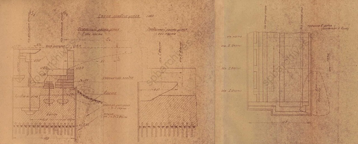 Исследование деформаций Екатерингофского разводного моста через р. Екатерингофку. Схема правого устоя, трещина в устое. 1943 г. ЦГАНТД СПб. ф.275; оп.21; д.676; л.22
