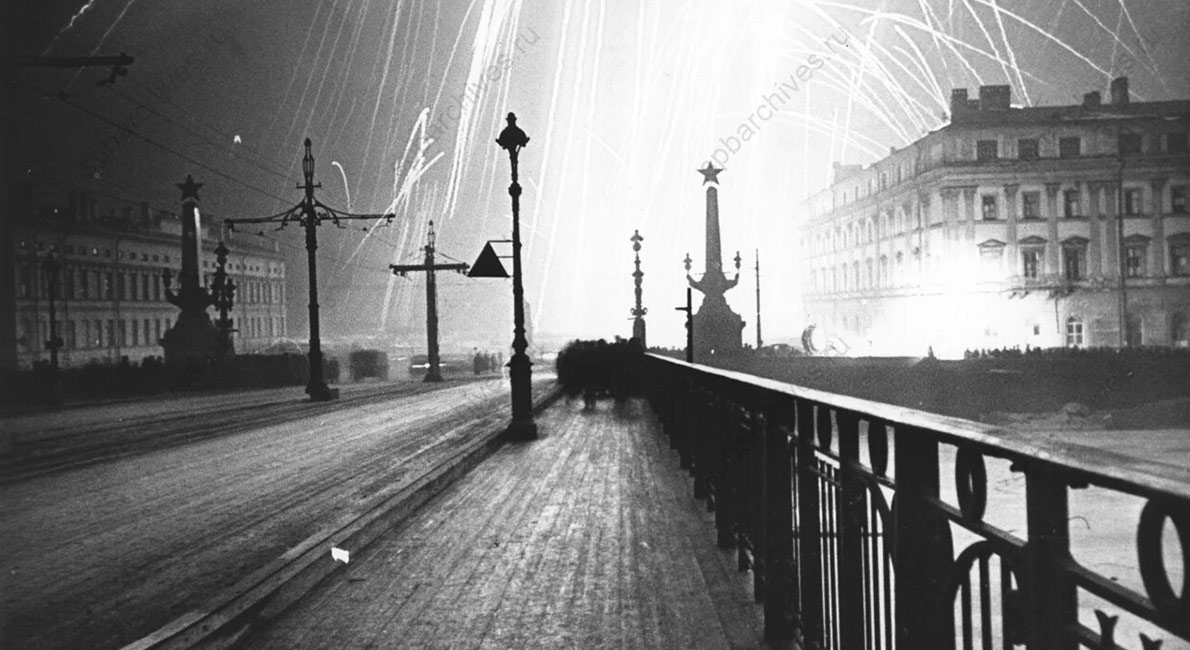 На Кировском (Троицком) мосту во время салюта в ознаменование полного освобождения Ленинграда от фашистской блокады. 27 января 1944 г. ЦГАКФФД СПб. Ар 49610