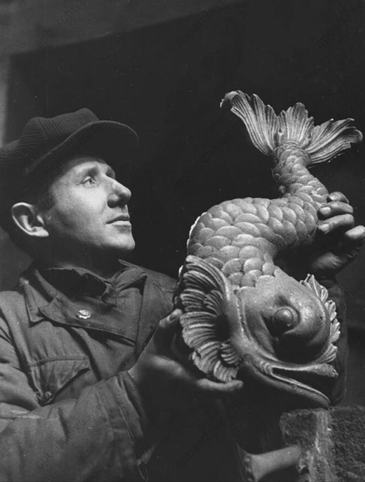 Извлечение из укрытия в саду Дворца пионеров, транспортировка и установка на Аничковом мосту скульптурных групп Петра Клодта «Укрощение коня». 22 мая–2 июня 1945 г. Автор съемки: Трахтенберг Давид Михайлович. ЦГАКФФД СПб. Ар 100434, 100085, 99348, 99363