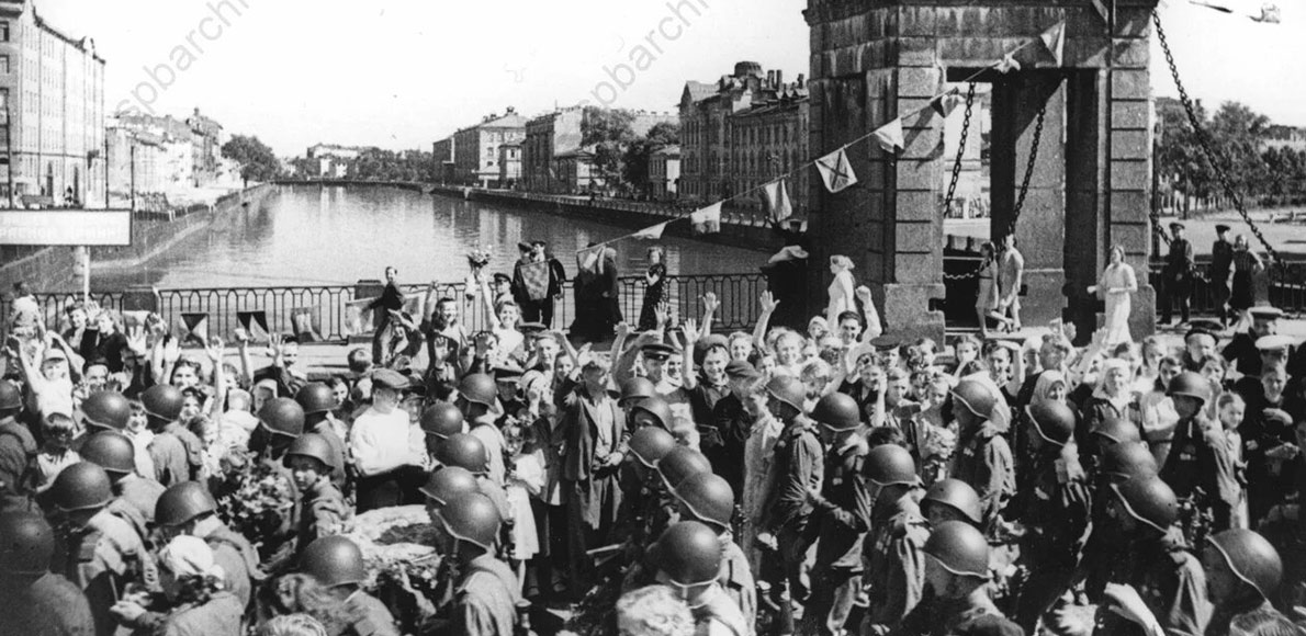 Гвардейцы проходят по Старо-Калинкиному мосту. 8 июля 1945 г. Авторы съемки: Нордштейн Семен Григорьевич, Тарасевич Всеволод Сергеевич. ЦГАКФФД СПб. Ар 178053