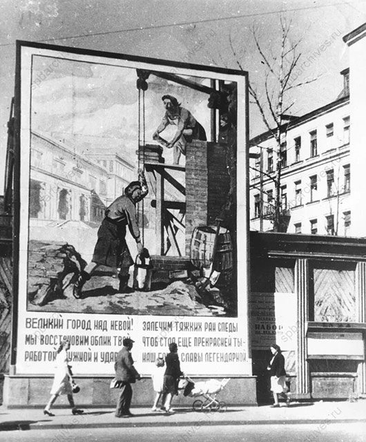 Плакат, призывающий к восстановлению города после блокады. 1945 год Автор съемки: Трахтенберг Давид Михайлович. ЦГАКФФД СПб. Бр 33974