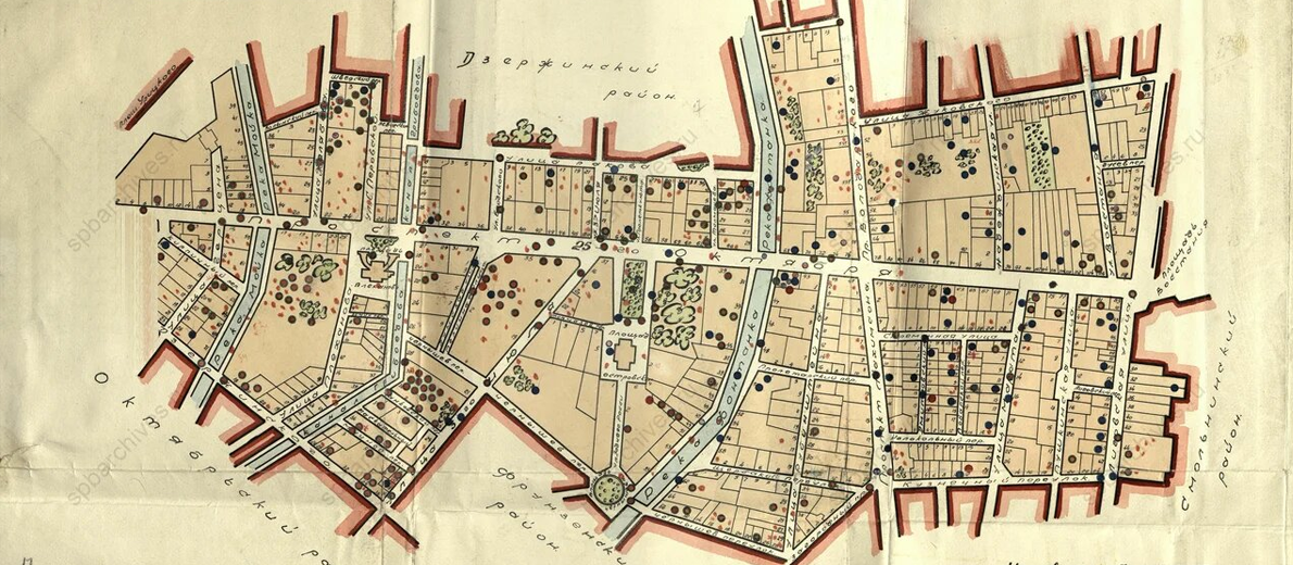 Карта разрыва фугасных авиабомб, артснарядов и очаги пожаров в Куйбышевском (Центральном) районе. 1945 г. Показаны места разрывов снарядов на мостах. Подлинник. ЦГА СПб. Ф. 4886. Оп. 1. Д. 143. Л. 2.