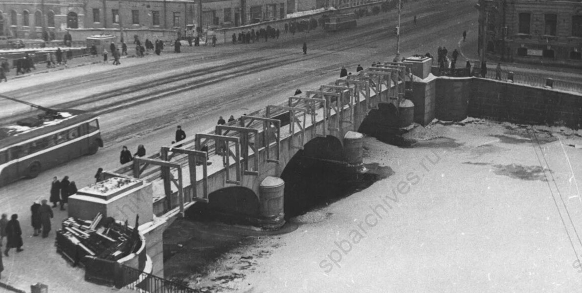 Весной 1942 года мосты помогли ленинградцам привести в порядок город, измученный блокадной зимой. Грузовыми автомобилями и трамваями на мосты привозили снег и лед, убранные с городских улиц, и сбрасывали в реки и каналы.
