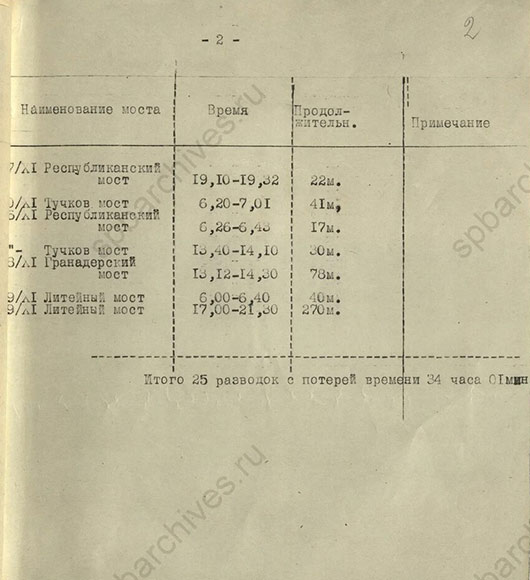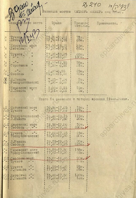 График разводки мостов за октябрь и ноябрь 1942 г. ЦГА СПб. Ф. 7384. Оп. 17. Д. 791. Л. 1, 2